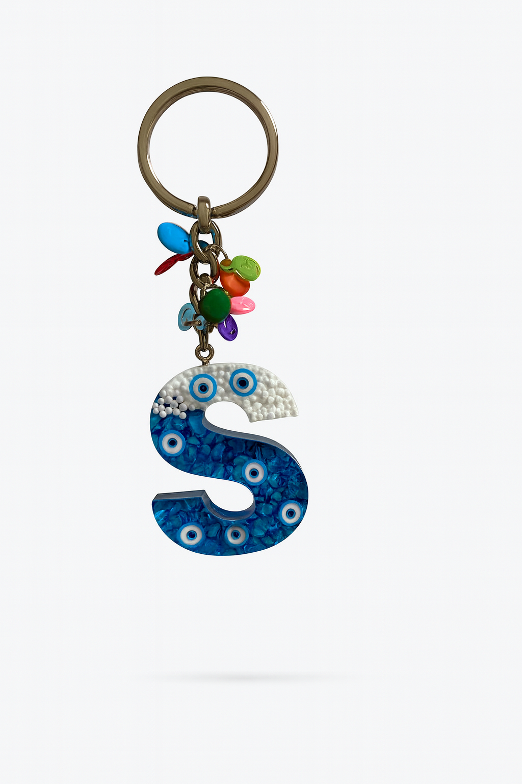 Epoksi Harf Anahtarlık – S Harfi, Nazar Boncuklu ve Renkli Charm Detaylı