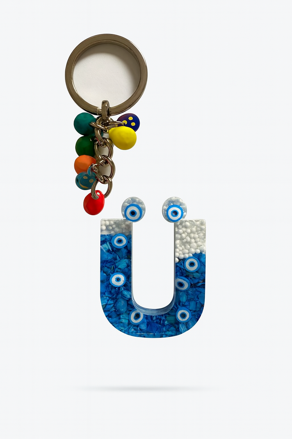 Epoksi Harf Anahtarlık – Ü Harfi, Nazar Boncuklu ve Renkli Charm Detaylı