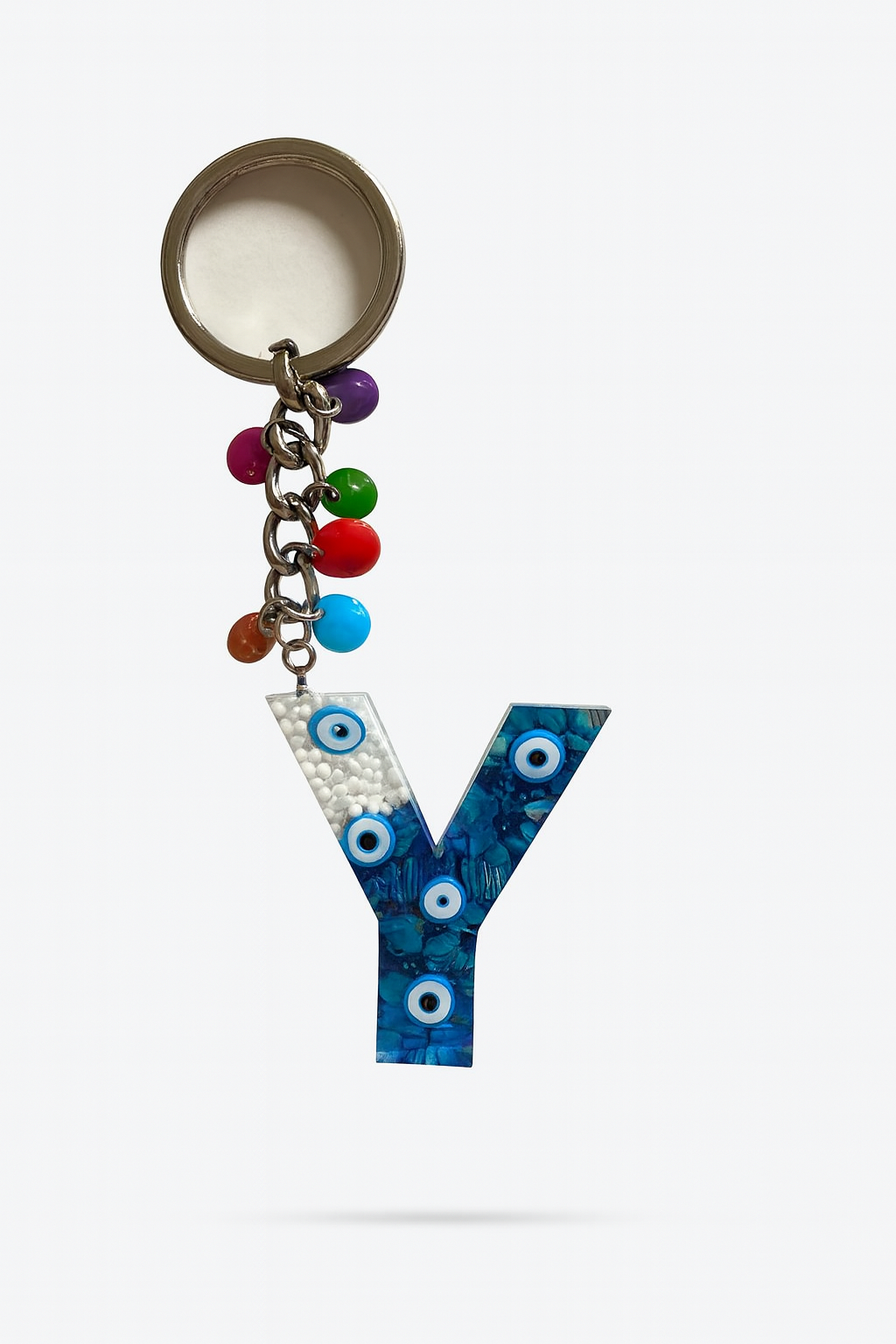 Epoksi Harf Anahtarlık – Y Harfi, Nazar Boncuklu ve Renkli Charm Detaylı