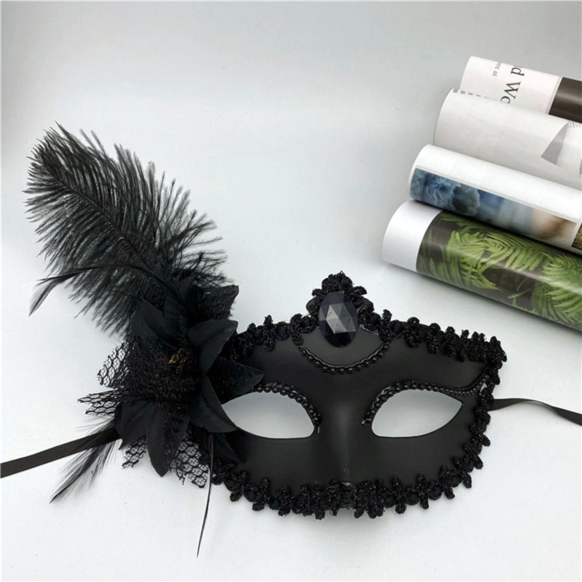Siyah Mat Renk Yandan Tüylü Güllü Parti Balo Venedik Maskesi 16x22