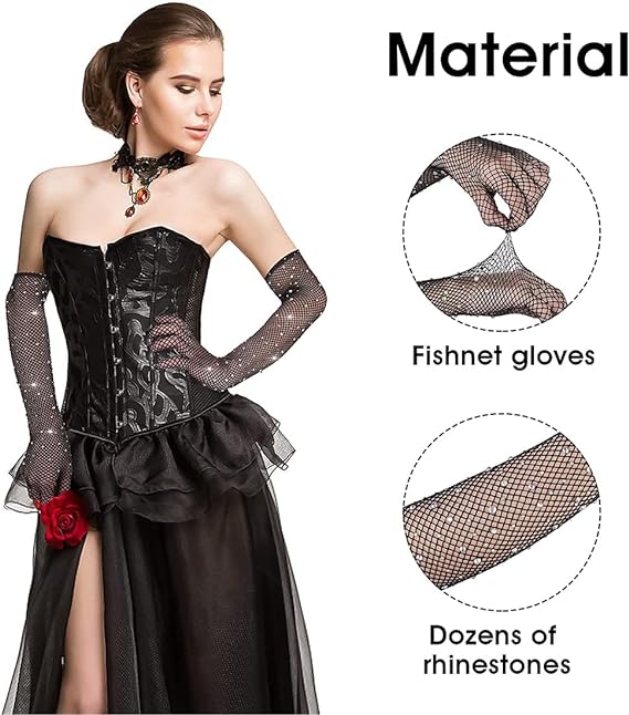 Siyah Renk İncili Elmas İşlemeli File Örgü Uzun Eldiven 45 cm
