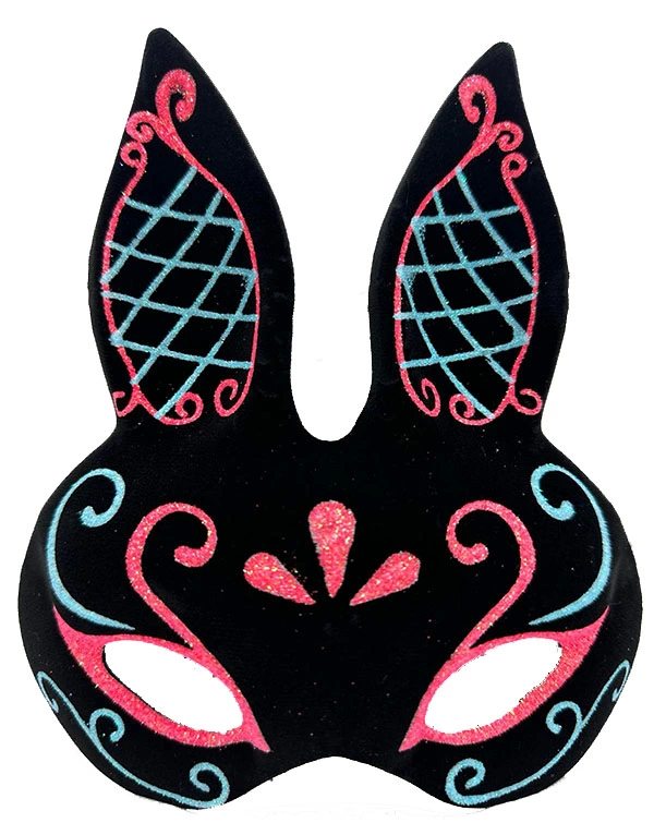Gizemli ve göz alıcı bir görünüm için siyah süet kaplama, mavi kırmızı simli tavşan maskemiz tam size göre