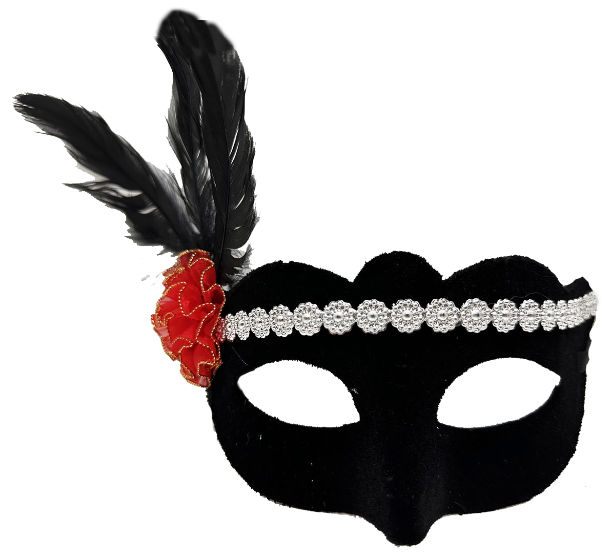 Siyah Renk Süet Kaplama Gümüş Dantelli Kırmızı Gül Tasarımlı Parti Maskesi (18x20 cm)