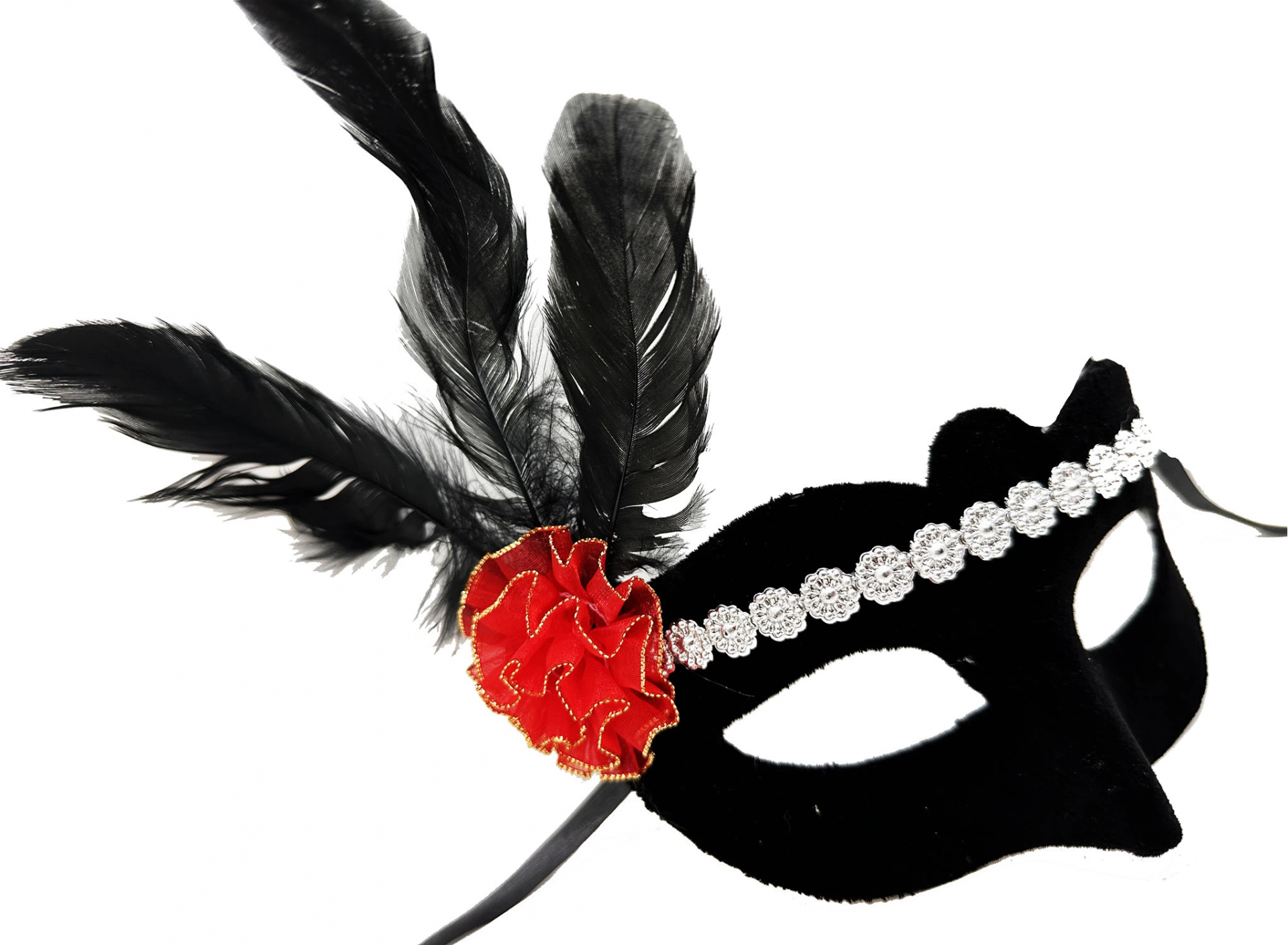 Siyah Renk Süet Kaplama Gümüş Dantelli Kırmızı Gül Tasarımlı Parti Maskesi, balolar, maskeli partiler veya özel geceler gibi özel günlerde romantik ve zarif bir görünüm elde etmek isteyenler için mükemmel bir seçimdir. Yumuşak süet kaplaması, gümüş dantelleri ve zarif kırmızı gül tasarımı ile bu maske sizi partinin en şık konuğu yapacak.