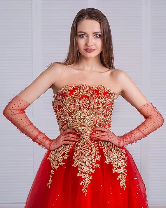 Uzun Boy Kırmızı Puantiyeli Kırmızı Renk Tül Eldiven